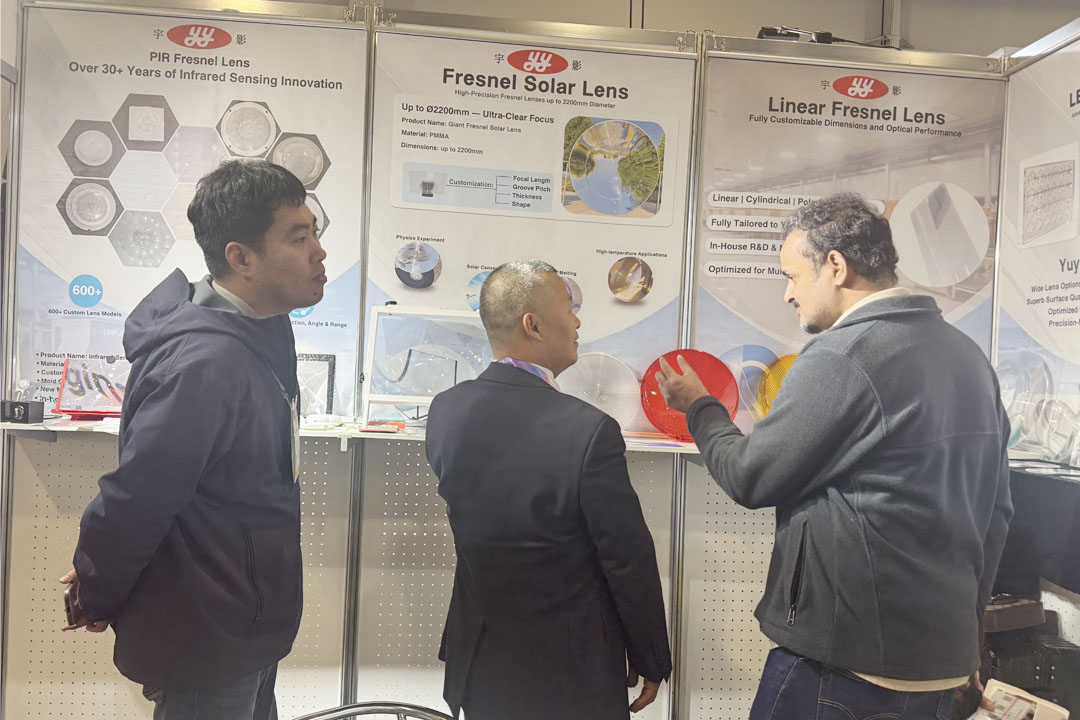 作为深耕菲涅尔光学行业三十余年的源头制造企业,宇影光学此次重点展出了大尺寸菲涅尔透镜,PIR 红外感透镜、LED / 投影用菲涅尔透镜、线性菲涅尔透镜、显示与成像用精密光学元件,以及阅读与放大类菲涅尔光学解决方案,全面覆盖智能感应、消费电子、工业视觉、显示投影与日用光学等多个应用场景。